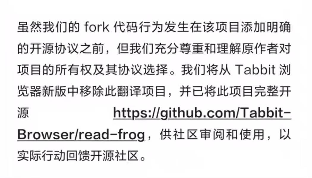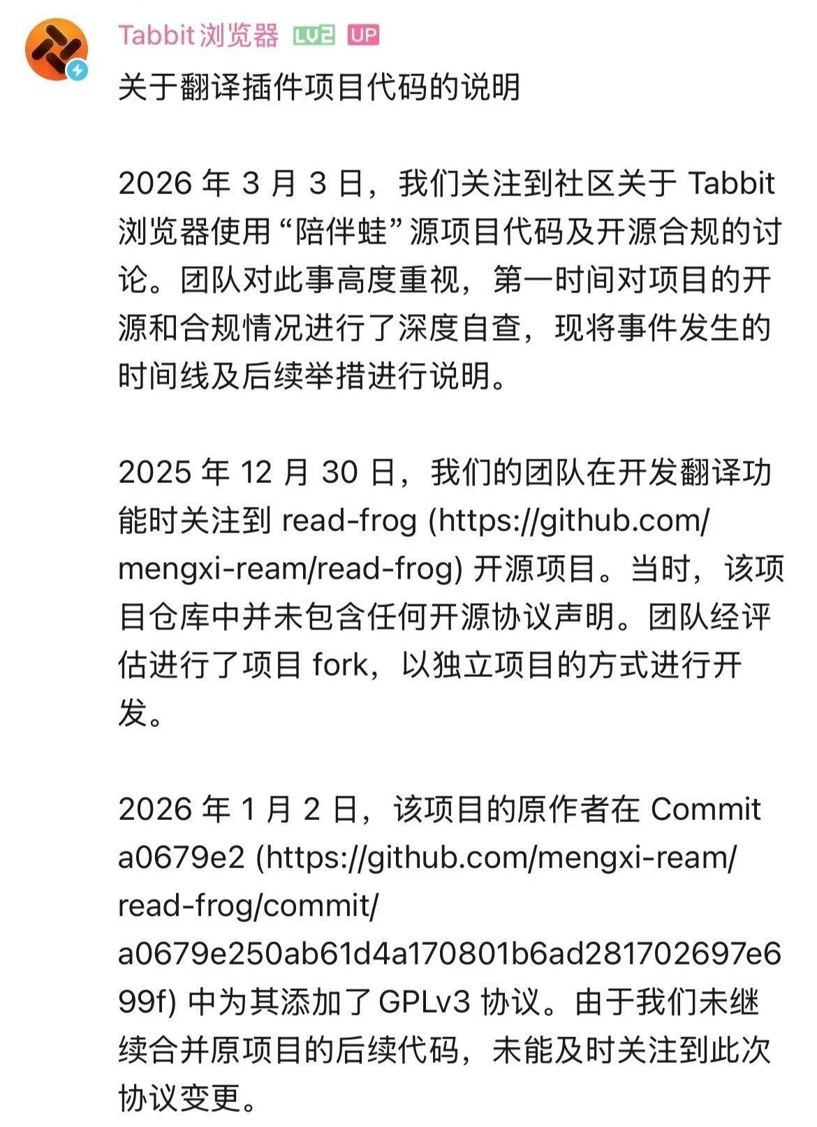 对此,Tabbit官方回应称,当时read-frog项目中仓库中并未包含任何开源协议声明。团队经评估进行了项目fork,以独立项目的方式进行开发。虽然我们的fork代码行为发生在该项目添加明确的开源协议之前,但我们充分尊重和理解原作者对项目的所有权及其协议选择。将从Tabbit浏览器新版中移除此翻译项目,并已将此项目完整开源。