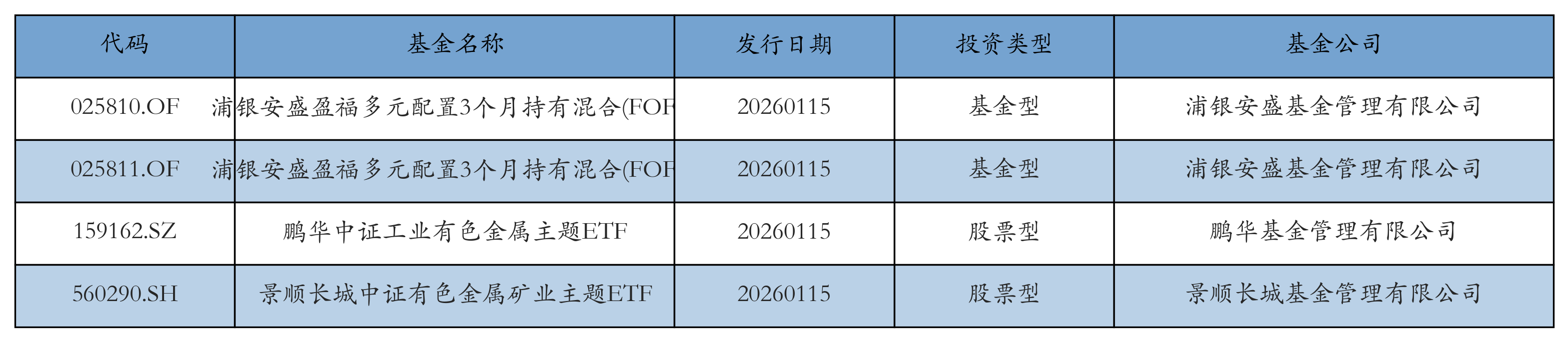 昨日有4只新基金发行,分别为:浦银安盛盈福多元配置3个月持有混合(FOF)A、浦银安盛盈福多元配置3个月持有混合(FOF)C、鹏华中证工业有色金属主题ETF、景顺长城中证有色金属矿业主题ETF,详情见下表: