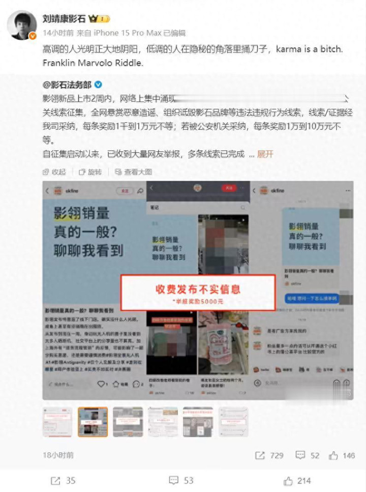 12 月 23 日,影石 CEO 刘靖康转发该博文并表示:高调的人光明正大地阴阳,低调的人在隐秘的角落里捅刀子,karma is a bitch. Franklin Marvolo Riddle.